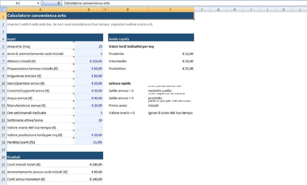 L’obiettivo non è avere un numero perfetto, ma capire l’ordine di grandezza. Già con poche modifiche ti accorgerai che sotto una certa dimensione il risparmio è limitato, mentre con un orto più ampio la situazione può cambiare in modo significativo.