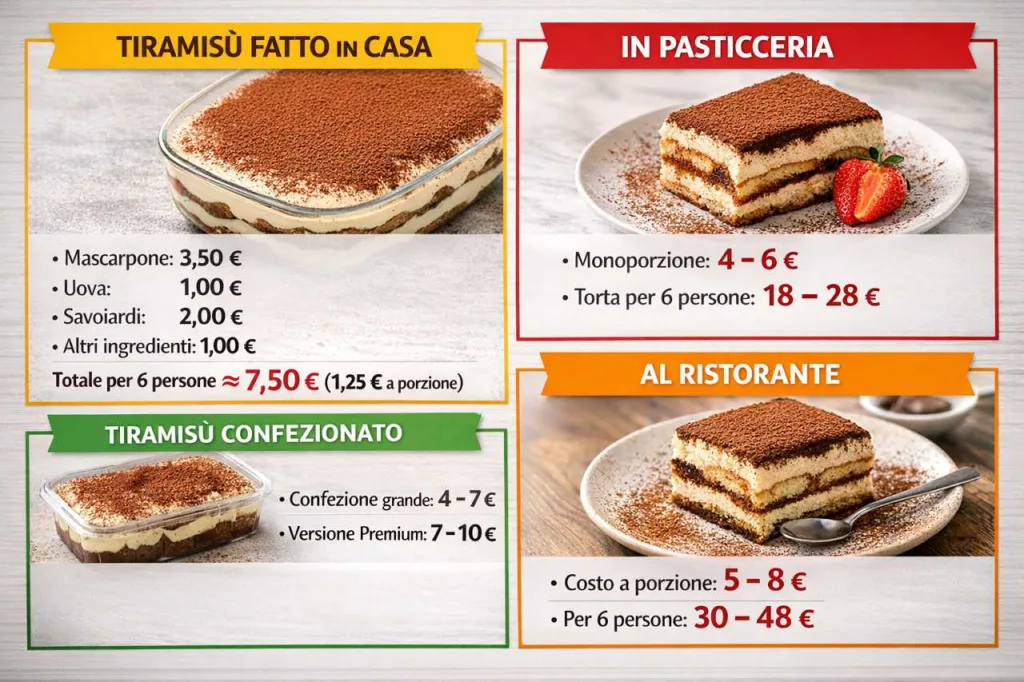 Il tiramisù è uno dei dolci italiani più amati in assoluto. Cremoso, profumato di caffè e cacao, è spesso il dessert che chiude pranzi e cene in famiglia. Ma quanto costa davvero prepararlo a casa? Conviene farlo oppure comprarlo già pronto in pasticceria, al ristorante o al supermercato? Vediamo un confronto realistico tra tiramisù fatto in casa, tiramisù di pasticceria, tiramisù confezionato e tiramisù servito al ristorante.