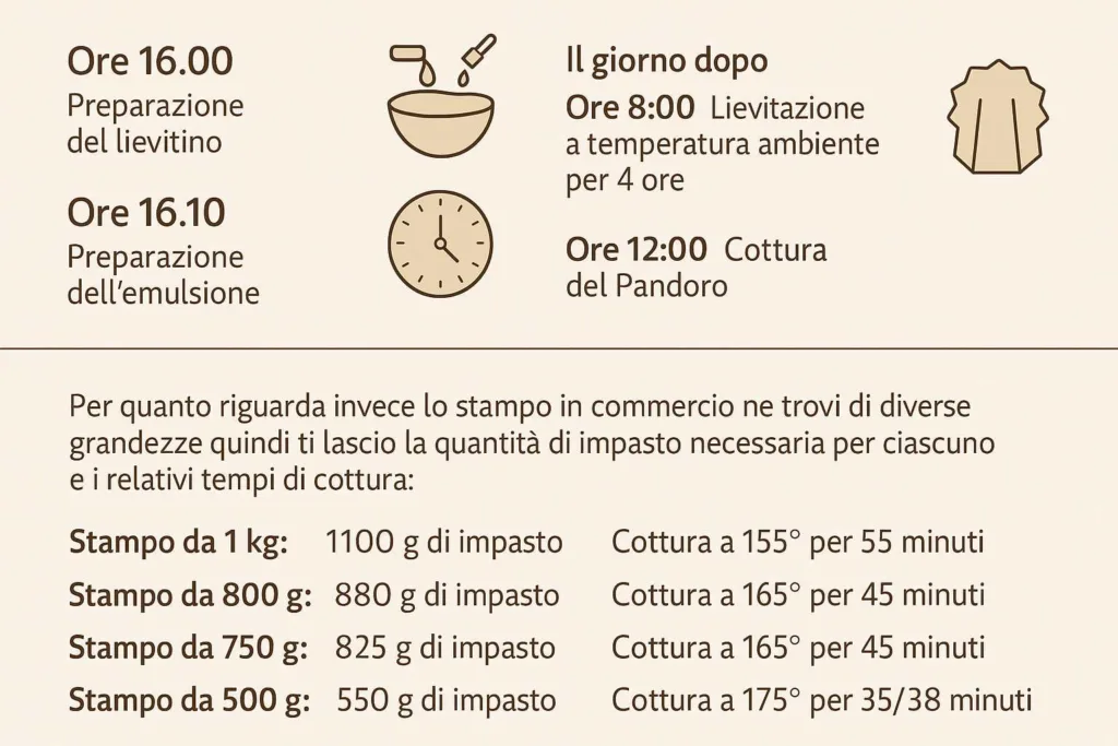 La preparazione del Pandoro con il metodo veloce non è particolarmente complicata ma è necessario seguire alcune tempistiche ben precise. Ti sarà senz’altro utile questa tabella di marcia: